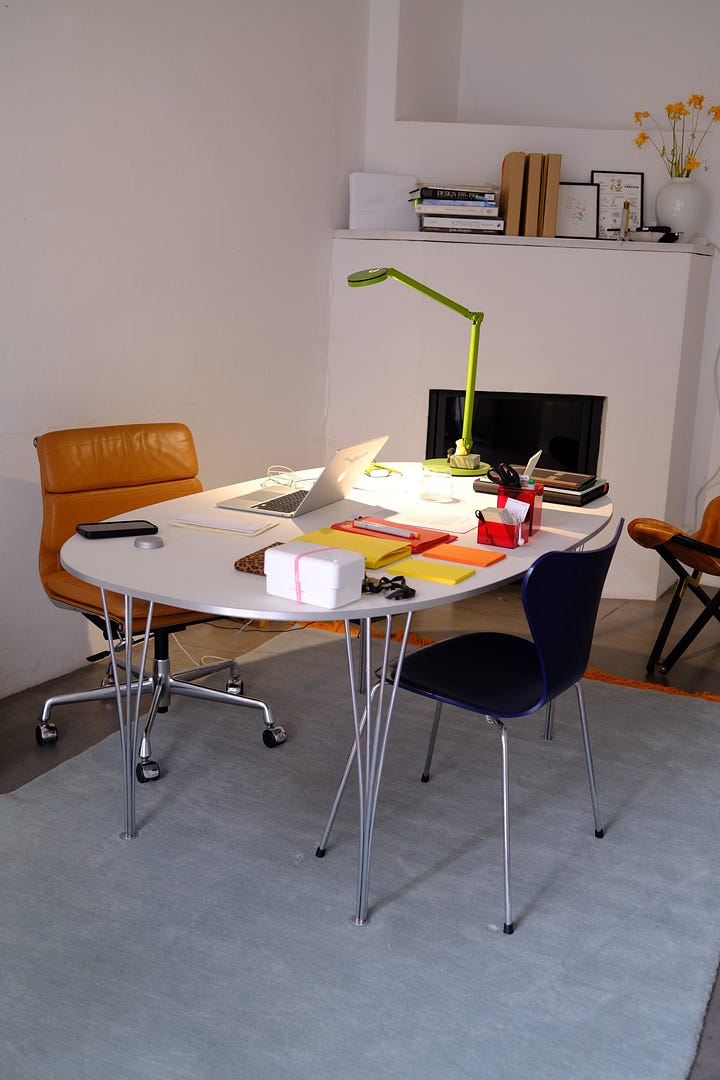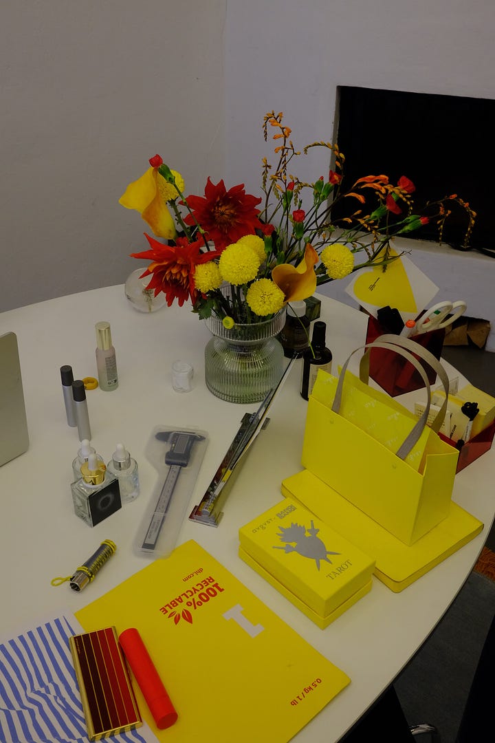 Я заказала большой овальный стол Arne Jacobsen и винтажное кресло Herman Miller и отправилась в магазин канцелярских принадлежностей (блокноты и ручки — моя слабость, хорошая ручка может поднять мне настроение, а бесплатную промо‑ручку я даже в руки не возьму). Самые красивые предметы в моём детстве — это ГДРовские дверные ручки рубинового цвета и цветные прозрачные бокалы в бабушкином буфете. Я поняла, что всегда цепляюсь глазами за всё, что на них похоже. По сути, первые украшения «Августа» их воспроизводят. Я купила кубы из цветного акрила и прозрачные вазы базовых цветов — жёлтого, красного и синего.