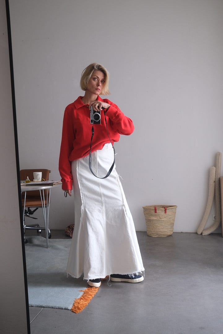 Если раньше в гардеробе были только чёрный и белый цвета, то теперь очень много красного и денима.
